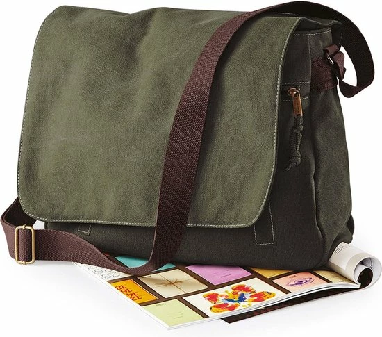 Canvas schoudertas donkergroen 14 liter. Legergroene schoudertas met klittenbandsluiting en een verstelbare schouderband gemaakt van gewassen canvas, voorzien van bronskleurige klemmen. Het hoofdcompartiment is voorzien van een ritssluiting, de flap van klittenbandsluiting en de tas heeft een verstevigde onderkant. Inhoud: 14 liter. Type: Vintage. Materiaal: 100% canvas katoen. Formaat: 40 x 30 x 12 cm. Unisex tassen voor dames/heren/volwassenen – Schoudertassen/documententassen/werktassen/schooltassen.