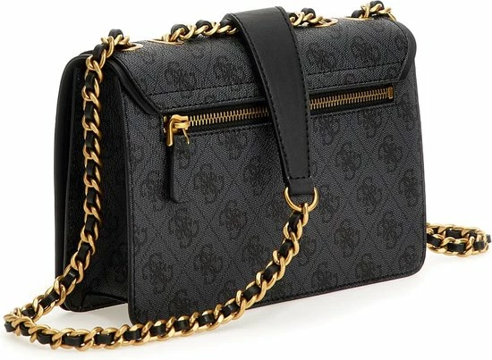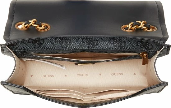 Zwarte schoudertas afgewerkt met gouden details en een all over logo print uit de nieuwe collectie van Guess. De tas is ideaal voor dagelijks gebruik