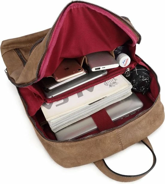 Op de voorzijde van de tas zitten 2 ruime ritsvakken. Op de achterzijde zit ook een ritsvak. Aan de bovenzijde zit een handvat waarmee je de rugtas makkelijk en snel op kunt pakken. Middels de twee verstelbare schouderbanden is de rugtas comfortabel op de rug te dragen.