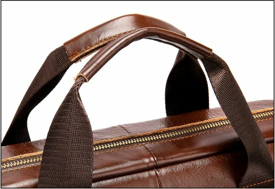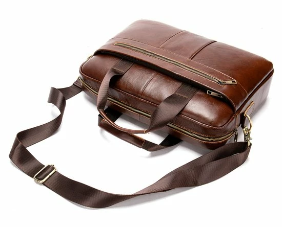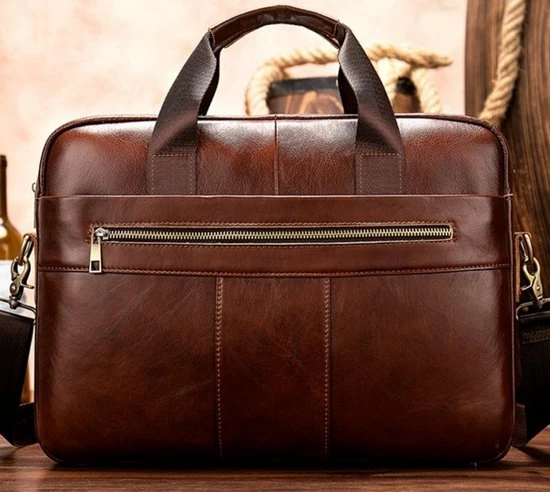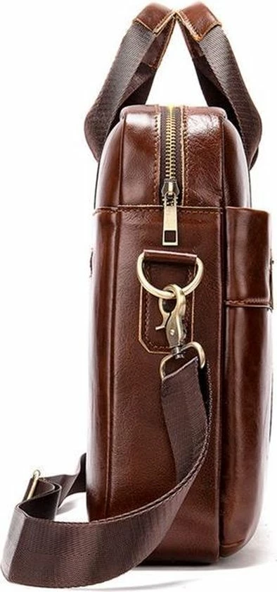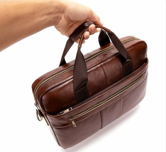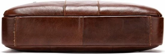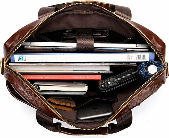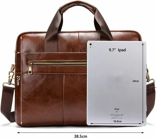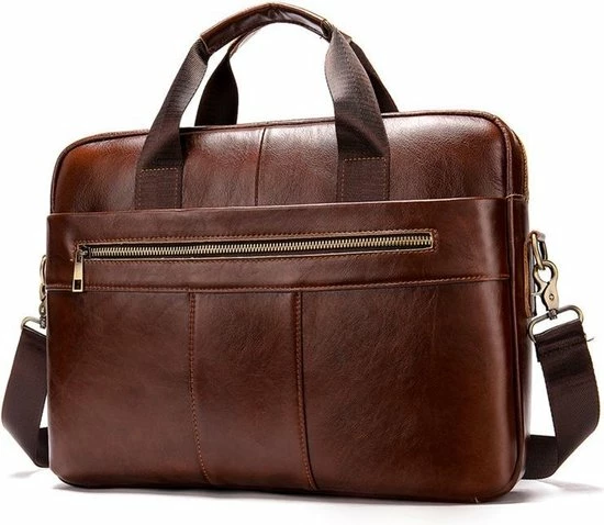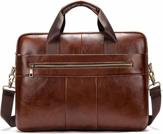 Stijlvolle laptoptas van mooi hoogwaardig leer. De tas bestaat uit twee compartimenten: het voorste hoofdcompartiment bevat twee kleine steekvakken, een groot steekvak waar A4 documenten in passen. Het achterste hoofdcompartiment heeft een steekvak voor een telefoon of andere accessoires en gewatteerd laptopvak dat geschikt is voor een 15 inch laptop. Op de voorzijde van de tas zit รฉรฉn groot en รฉรฉn kleiner ritsvak. De tas heeft een verstelbare en afneembare schouderband zodat u de tas ook als schoudertas kunt dragen.