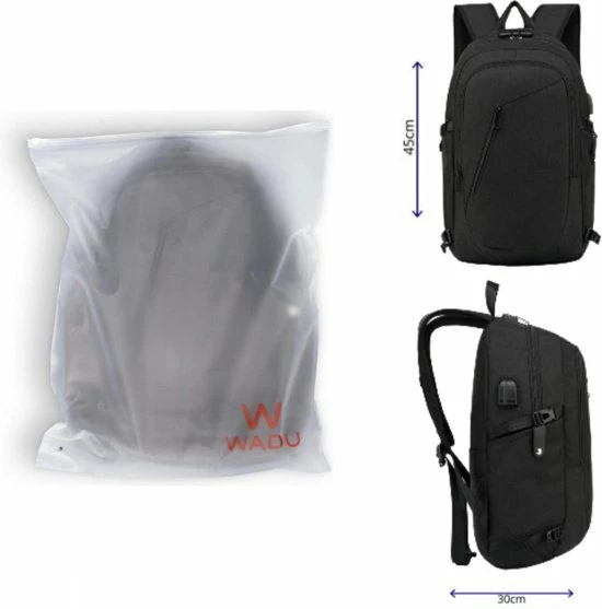 De anti diefstal rugtas is voorzien van een externe USB-poort waarmee je eenvoudig onderweg je telefoon kunt opladen. Om de tas nog veiliger te maken, heeft Wadu er voor gezorgd dat elke rugzak beschikt over een cijferslot die bevestigd is aan de bovenkant van de rugzak.
