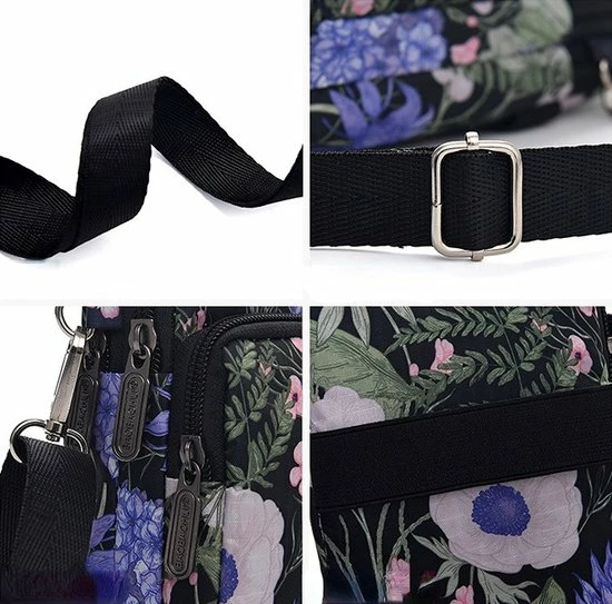 De tas heeft drie vakken die sluiten met een rits. Zo heb je plek voor je telefoon en wat kleine spullen. Het verstelbare crossbody hengsel is afneembaar.