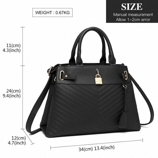 De afmetingen van de Miss Lulu schoudertas is 34cm x 24cm x 12cm. Het gebruikte materiaal is een sterk PU-leer, wat gemakkelijk schoon te houden is, en de tas een prachtige look geeft.