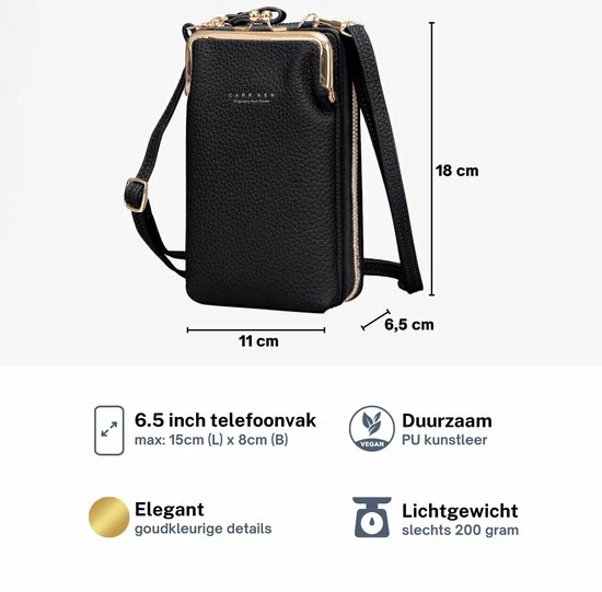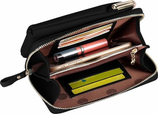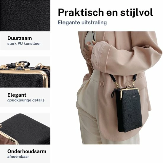 “De elegante schoudertas portemonnee met telefoonvak is groot genoeg voor de meeste telefoons (tot ongeveer 6,5 inch). Door de afneembare en verstelbare schouderband neem je dit schoudertasje makkelijk overal mee naartoe”