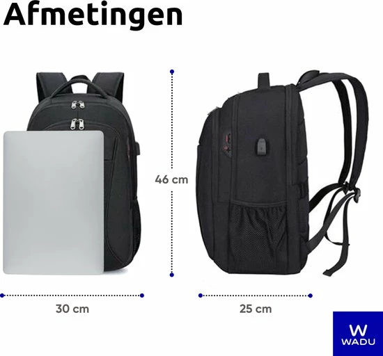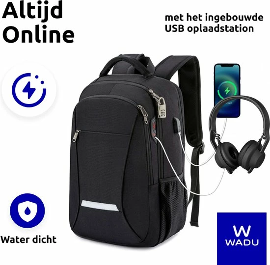 De anti diefstal rugtas is voorzien van een externe USB-poort waarmee je eenvoudig onderweg je telefoon kunt opladen. Om de tas nog veiliger te maken, heeft Wadu er voor gezorgd dat elke rugzak beschikt over een cijferslot die bevestigd is aan de bovenkant van de rugzak.