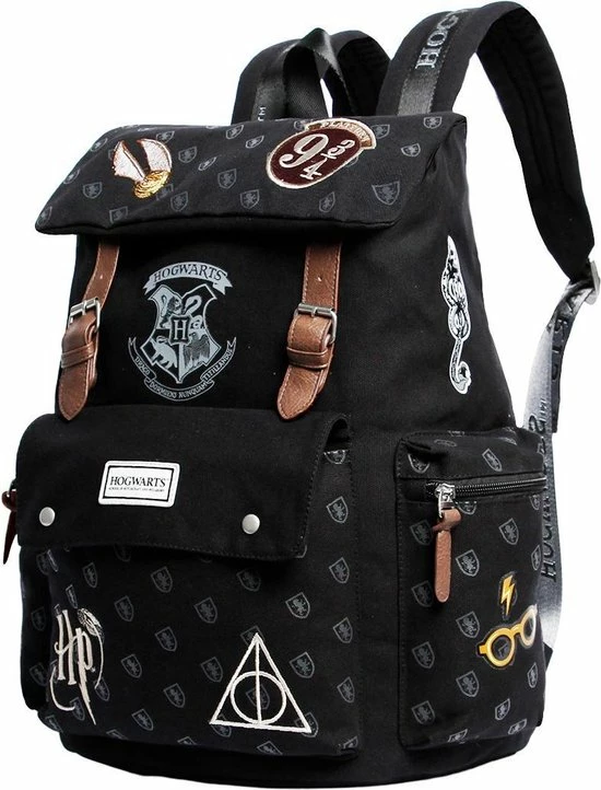 Op de rugzak vind je het wapen van Hogwarts samen met een heleboel verschillende symbolen uit de Harry Potter wereld.