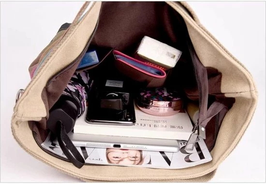 De canvas handtas is voorzien van een makkelijk hengsel. Eventueel kun je de tas ook als schoudertas gebruiken. De meegeleverde schouderiem bevestig je namelijk eenvoudige aan de ringen van de handtas. Deze tote bag heeft een praktische en zeer ruime indeling met twee grote hoofdcompartimenten. Er is meer dan voldoende plaats voor jouw tablet, maar ook andere documenten, boeken en een agenda neem je makkelijk met je mee. Deze handtas van Miss Lulu heeft tevens twee ritsvakken waarin je accessoires en kleine spullen veilig kunt opbergen.