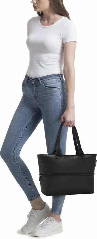 Een handige boodschappentas die meegroeit met je aankopen, de reisenthel shopper E1. Wie overkomt het niet, je koopt altijd meer dan in je tas past. Met de shopper E1 is dit nu verleden tijd, halverwege de tas loopt een rits als je deze open ritst dan gaat het volume van de tas van 12 ltr. naar 18 ltr. Ook nieuwsgierige blikken kan je uit je tas houden door hem dicht te ritsen en je portemonnee berg je veilig op in een extra vak. De handvatten zijn lang genoeg om hem in de hand maar ook over de schouder te dragen.