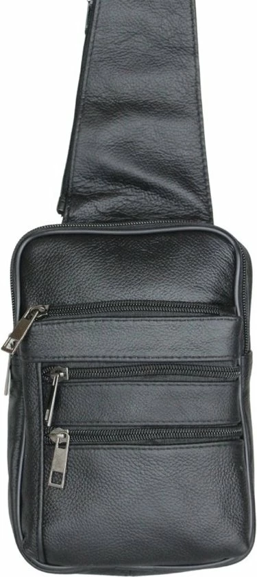 Leren schuine schoudertas/rugzak in het zwart. Handige tas voor heren, te gebruiken voor de rug of aan de voorzijde. De crossbody tas is gemaakt van echt leer, waardoor dit soepel en duurzaam is. De tas heeft een hoofdvak en 3 kleinere vakken aan de voorzijde. Er is een vak met rits aan de achterzijde, wat niet zichtbaar is. Tevens bevindt zich een vak met rits aan de bovenzijde van de schoudertas, dit is super handig. Dit is een tas om mee te nemen naar vakantie, of dagelijks gebruik. Zo heb je alles dus: portemonnee, telefoon, sleutels, paspoort etc op één plek. Dit kan eventueel onder de jas gedragen worden dus niet zichtbaar, erg veilig!