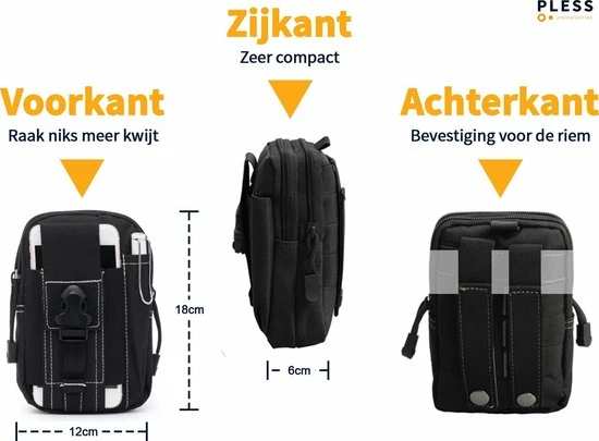 Compact, voorzien van twee ruime vakken die afsluitbaar zijn met een rits. Ideaal voor het opbergen van geld, sleutels, benodigdheden als een powerbank voor onderweg of persoonlijke accessoires. De voorzijde is voorzien van een extra vakje voor telefoon met quick-release gesp sluiting en biedt tevens ruimte voor een pen of een kleine zaklamp. Dankzij de elastische band aan de achterzijde bevestigt u het tasje aan uw riem zodat deze niet snel gestolen kan worden. De heuptas heeft een compact formaat van 12 x 6 x 17,5 cm en is gemaakt van stevig, waterdicht nylon. Een ideale tas voor op reis of voor allerlei buitenactiviteiten!